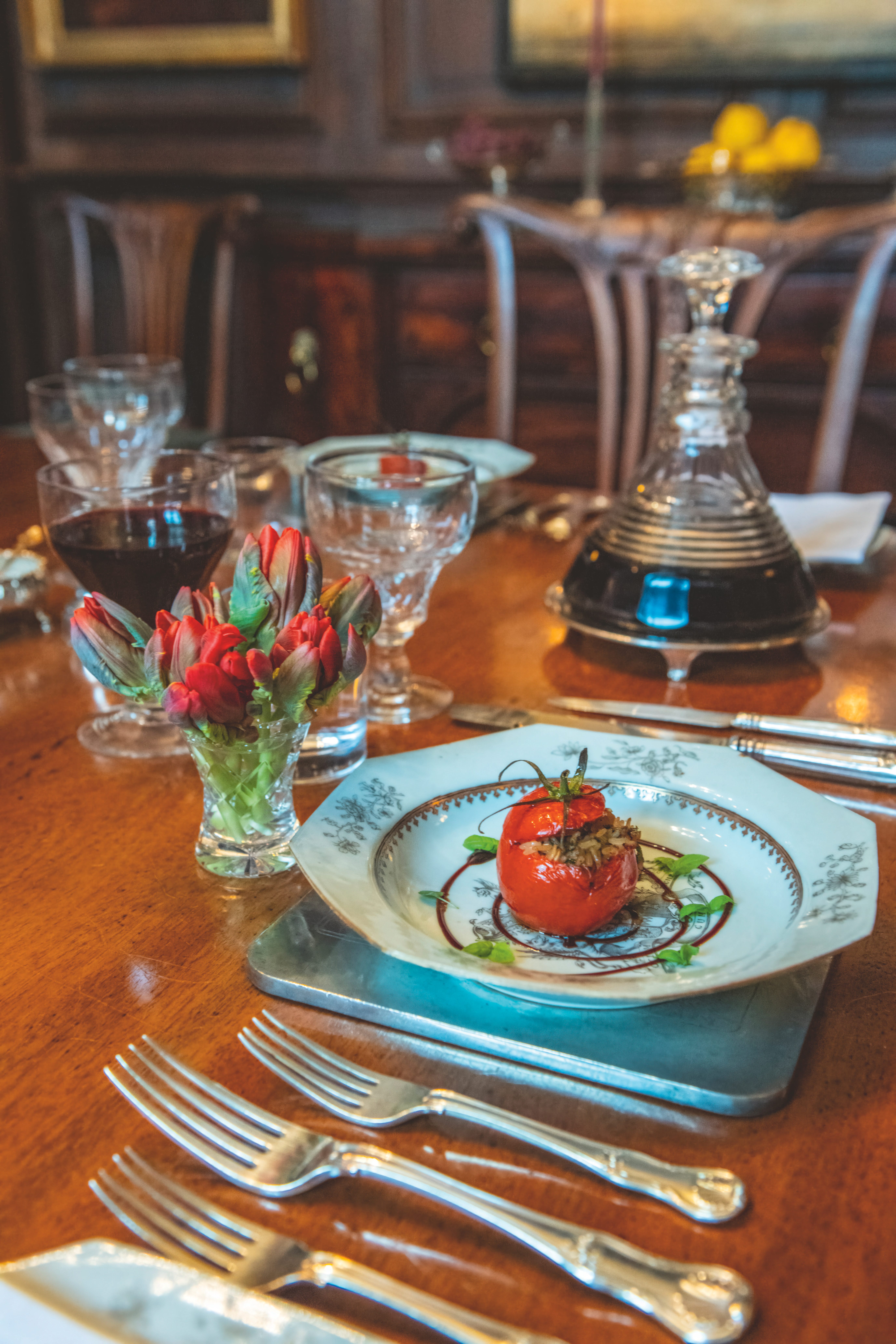 We have, in the last few seasons, started cooking from it again at Mapperton. The recipes have become the heart of what we now call the American Heiress Suppers: small candlelit dinners staged as part of our Grand Historic Tours, where the menu is Alberta’s and the table is set the way she would have set it. The Canards aux Cerises tastes, more or less, the way it tasted in 1908.